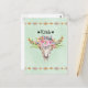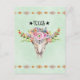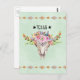 Um cartão-postal hippy boho com um crânio de vaca tribal do sudoeste, com tema tribal, e arranjo floral em aquarelas. As flores são uma coleção colorida que inclui cor de laranja rosa e vermelho. Uma borda em forma de diamante em cor de latão de bronze decora a parte superior e inferior desta placa. Texto diz Texas com duas estrelas desenhadas à mão em ambos os lados. O fundo é uma cor verde-clara.