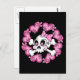 Crânio bonito e bósforos com arco pontilhado de polca cercado por corações e flores cor-de-rosa.