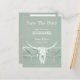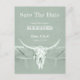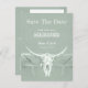 Oestern rústico country vintage estilo cowboy antigo. Divertido cartão postal de salvação da data de casamento em verde oliva pastel. Convites de crânio de touro. Use um pouco de humor com este design inspirado em casa de fazenda engraçado. Velho oeste selvagem, único. Animal de fazenda legal e moderno. Fundo verde com letras brancas. Personalize a escrita e a tipografia. Procurando convites correspondentes nesta coleção. Direitos autorais da imagem Marg Seregelyi Photography.