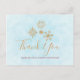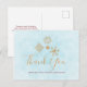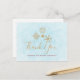 Cartão de agradecimento com uma ilustração de flocos de neve dourados sofisticados com formas cristalinas elegantes. Um fundo azul claro gelado. Mensagem personalizada no verso.