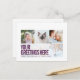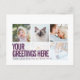 Cartões-postais personalizados roxo branco 6 fotos da família Modernos e Elegantes Cumprimentos Universais com uma colagem de fotos estilosa com 6 imagens personalizadas, sua mensagem de cumprimentos em negrito e fonte sans serif moderna e chamativa, seu nome, data, ano, mensagem no verso em uma fonte tipográfica minimalista e sem serifa legal. Estética minimalista preta e branca, mas você pode editar o cartão-postal em qualquer cor.