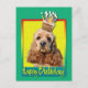 Celebrar um aniversário com este Cartão de Saudação de Cachorro Cocker Spaniel. Com um cupcake balanceado na cabeça, este design pode trazer um sorriso e risadinhas! BTW, Este design tem várias versões, com diferentes cores de fundo. Há também um convite para uma versão do Partido.