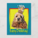 Celebrar um aniversário com este Cartão de Saudação de Cachorro Cocker Spaniel. Com um cupcake balanceado na cabeça, este design pode trazer um sorriso e risadinhas! BTW, Este design tem várias versões, com diferentes cores de fundo. Há também um convite para uma versão do Partido.