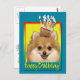Celebrar um aniversário com este Cartão de Saudação de Cão Pomeraniano. Com um cupcake balanceado na cabeça, este design pode trazer um sorriso e risadinhas! BTW, Este design tem várias versões, com diferentes cores de fundo. Há também um convite para uma versão do Partido.