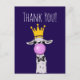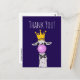 Cartão postal de agradecimento de uma lhama caprichosa soprando uma bolha enquanto mastiga chiclete. Usando uma coroa de ouro e uma gravata borboleta preta. Este lama fofo só é visível do pescoço para cima. tem um pescoço cartoonisticamente longo.