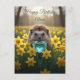A cute hedgehog holding an aquamarine heart sits in a field of yellow daffodils.