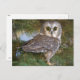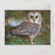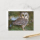 Cartão de animais mostrando uma coruja fofa sentada em uma árvore de abetos.