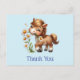 Obrigado postal com uma ilustração adorável. Um pequeno pônei marrom comendo margaridas felizes.