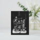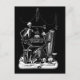 cartão postal da banda esquelética: aqui temos a arte da morte preta e branca vindimada de 1850, um esqueleto se senta com instrumentos de esqueleto incluindo uma guitarra, um chifre e uma harpa, outros crânios e ossos, assim como uma ampulheta pôs a cena. Os drapes estão separados acima.