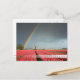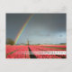 Cartão postal de um arco-íris colorido em um céu escuro sobre um moinho de vento e um campo cheio de tulipas vermelhas brilhantes durante uma tempestade de primavera em uma paisagem perto de Amsterdã, na Holanda, com uma barra desbotada e o texto: 'Holanda'.