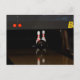 Uma placa de posto com foto de dois pinos prestes a ser derrubada por uma bola de boliche.