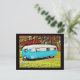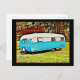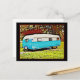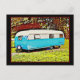 RV antigo. A caravana retrô é azul e branca brilhantes. Está rodeado de grama verde vívida e uma pequena floresta é o pano de fundo. Esta arte fotográfica é pura nostalgia.