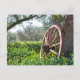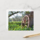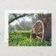 Roda de carruagem de madeira inclinada contra o tronco das árvores no jardim rural