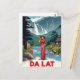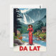 Escape to the 'City of Eternal Spring' with this gorgeous vintage travel poster style postcard for Da Lat, Vietnam. The design features a stunning highland landscape with a cascading waterfall and rolling mountains. A graceful woman in a traditional red Ao Dai and nón lá (conical hat) stands by a clear river, while local figures and a deer complete the peaceful scene. This card beautifully captures the cool climate and serene beauty of the region. Perfect for sending greetings, decorating with retro Southeast Asian art, or celebrating the Vietnamese highlands.