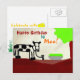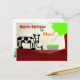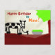 Vaca de aniversário dizendo: "Feliz aniversário para Moo, comemore com queijo!!"