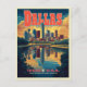 Transporte-se para a vibrante cidade de Dallas com o nosso extraordinário cartão postal de poster de viagens retrô. Apresentando uma linha do horizonte colorida e ousada, padrões geométricos e inscrições icônicas, este cartão postal captura a essência do Estado Estrela Solitária.