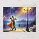 Isso captura a cena romântica de um casal dançando sob o poste com o pano de fundo da cidade.