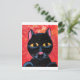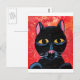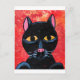 Um gatinho preto com um fundo vermelho e laranja feroz.