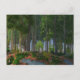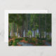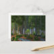 Um povoado de árvores num dia ensolarado de verão. As árvores altas são altas e escuras, mas as mudas por baixo têm um crescimento novo e brilhante. Crescer através das folhas caídas são o verde, o rosa e o branco de trevo e outros cobrir moídos.