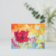 Amaryllis Morning Glories Postcard. Este cartão colorido retrata um spray de Red Amaryllis e de Morning Glories em um fundo laranja e azul.