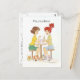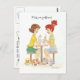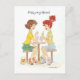 Duas meninas, uma com cabelo vermelho e a outra com cabelo castanho tomando um refrigerante em uma mesa pequena.
