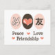 Um símbolo de paz, coração e o caráter chinês para um cone de amizade em camisas de amizade, roupa, roupas e mais mercadorias, acessórios, joias e presentes que dizem a Amizade do Amor pela Paz em rosa e marrom. Clique no link a seguir para ver toda nossa querida e original Chrissy H.