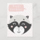 NewParkLane - Cartão postal, com um adorável guaxinim preto, branco e cinza em aquarela, com um balão de texto rosa com um desejo de "Feliz Aniversário", contra um fundo rosa-claro e branco com padrão abstrato divertido.
