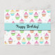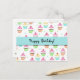 Este é um cartão postal de excelente para ser enviado para um aniversário. Ele apresenta um fundo coberto por pequenos cupcakes. Um gráfico de uma fita azul passa pelo centro com as palavras feliz aniversário. O texto na frente e atrás é personalizável.