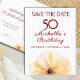 Celebre 50 anos incríveis com este elegante cartão floral Salve a Data. Apresentando uma flor de aquarela suave e um layout moderno e limpo, este design é perfeito para comemorações de marcos, desde festas de quic jardim a reuniões íntimas. Totalmente personalizável com seus detalhes de evento. Aproveite!