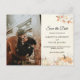 Anuncie seu casamento com estilo com este Cartão de Save the Date Floral de Outono Rústico. Com uma mistura quente de tons bege neutros, rosas em aquarela e folhagens suaves de outono, este design complementa perfeitamente casamentos de outono aconchegantes. A tipografia de letra elegante equilibra-se lindamente com o arranjo floral rústico, enquanto uma opção de foto personalizável adiciona um toque pessoal. Uma escolha atemporal para casais que planejam uma celebração romântica de outono, este cartão define o tom perfeito para o seu dia especial.