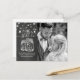 Modelos de cartões-postais para anúncio de casamento adiado com letra elegante e casal vintage com jarros de Mason e luzes de corda em fundo de quadro-negro.