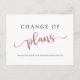 Informe aos seus convidados que a data do seu casamento mudou com este cartão-postal de anúncio de mudança de planos de casamento moderno e minimalista. "Mudança de" é escrito em uma tipografia clássica preta elegante e "planos" é escrito em uma fonte cor-de-rosa contemporânea contrastante. Você pode personalizar seus nomes e anúncio de adiamento na frente e fornecer mais detalhes no verso, como uma nova data ou se uma nova data será divulgada quando você a tiver.