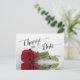 Este belo cartão é uma maneira elegante de informar aos seus amigos e familiares se você estiver na infeliz posição de ter que adiar seu casamento. Ele apresenta um design elegante e romântico com uma única rosa vermelha refletida em uma piscina de água, e caligrafia cursiva rendada que diz "adiar a data". O verso tem espaço para uma nota personalizada e assinatura.