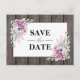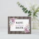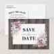 Cartões-postais de casamento country chic "save the date" com fundo de celeiro de madeira rústica, uma exibição de canto com suculentas e um modelo de texto de casamento fácil de personalizar.