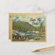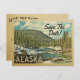 Este cartão postal antigo "Alaska Save The Date" possui muito charme com um estilo retrô legal de meados do século. Com um tema de natureza e ar livre, árvores cobertas de neve e um fluxo de rio turquesa sob nuvens fofas em um céu azul. Perfeito para amantes da natureza, casamentos ao ar livre e pessoas que amam aventuras e trilhas. Este cartão postal "Alaska Save The Date" será um prazer receber e enviar. Graças à foto de Davebloggs007 como base: https://www.flickr.com/photos/davebloggs007/9703049106/
