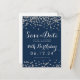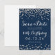 Modelo de design de convite de "Salvar a Data" para festa de aniversário de 18 anos com confetes prateados e texto de nome e data personalizados em Azul-marinho. Totalmente personalizável!