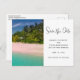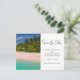 Save the date postcard with a beautiful photograph. A scenic tropical beach with aquamarine water and a white sandy beach with a lush forest in the back. A solitary umbrella available for those who love seclusion.