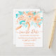 aquarela floral de praia tropical salvo o cartão de data com cor de coral de areia laranja pintada, flores azuis lacrimogêneas, folhas, elementos botânicos pampas.