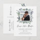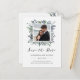 Este cartão postal moderno de save the date de casamento botânico apresenta uma moldura central com sua foto e folhas de aquarela em tons modernos de verde, azul e cinza para um visual elegante que é ao mesmo tempo minimalista e rústico.