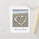 Um coração feito de conchas encontradas na praia em frente à maré oceânica rolando na areia faz um cartão postal adorável para ser enviado para seu casamento, aniversário ou outra ocasião especial. Personalize-o para o seu dia especial. Também estão disponíveis selos de correio de casamento de praia.