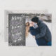 Este cartão postal de foto de férias moderno e elegante serve como um anúncio de "save the date" para o casal recém-engajado. A frente apresenta suas fotos com flocos de neve desenhados à mão e tipografia escrita à mão que diz "Beijos Alegres e Felicitações de Fim de Ano dos Futuros Sr. e Sra." em um fundo de quadro-negro. A parte traseira apresenta uma foto completa com uma sobreposição branca transparente com os detalhes da data, endereço e mensagem personalizada do "save the date".