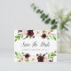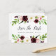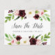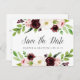 A Elegante aquarela floral salva os cartões postais de data com a inscrição "salve a data" na caligrafia chica com seus nomes e data de casamento embaixo, acentuadas pelas bordas superior e inferior das flores aquáticas em burgundy marsala e rosa pincelado com folhas verdes e folhagem. Cartões postais inversos para mostrar os detalhes adicionais da data, incluindo o site do casamento, com seu endereço de retorno e espaço para o endereçamento do destinatário.
