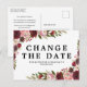 Cartões-postais de mudança de data de casamento de jardim rústico com um fundo branco chique e sofisticado que pode ser alterado para qualquer cor, uma variedade de flores aquareladas em marsala vermelho, burgundy e rosa beije, e um modelo moderno de "salve a nova data".