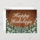 Cartão postal de Feliz Férias. Madeira marrom rústica, fundo nevado e floresta nevada. Estilo aconchegante vintage do campo. Mais itens estão disponíveis neste estilo em nossa loja. Você pode editar o design ainda mais, alterar cores, fontes e adicionar texto extra clicando no link "personalizar ainda mais".