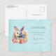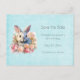 Save the date postcard with a watercolor image. A white gray bunny rabbit surrounded by a garland of pink and peach roses. For bunny lovers and Easter themes and birthdays and showers.