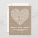 Um cartão postal com uma foto de fundo da burlap. A arte popular inspirou a ilustração de um coração branco no centro. Personalize o texto com detalhes da sua ocasião. Procure convites na Paperie de Jill.