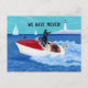 Cartão postal de anúncio de novo endereço do Cool Summer Labradors. Pintura caprichosa e engraçada de Labrador de verão pintada por Naomi Ochiai. Cães super legais da raça Labrador Retriever estão se divertindo com seu barco a motor no mar. O motorista do Labrador amarelo está tão fresco quanto um pepino!! O Labrador preto está posando como uma estrela!! E o Labrador Chocolate está se segurando firme a qualquer custo. Ótimo para amantes de cães que amam Labradores. Linda vista de verão com Labradores, mar, um barco e um farol.