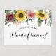 Peça aos seus amigos e familiares para fazerem parte do seu casamento com este cartão "Você será minha dama de honra" floral, apresentando elementos verdes botânicos, girassóis e rosas com escrita em caligrafia feminina. Itens correspondentes estão disponíveis. Cartão de proposta para cortejo