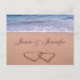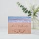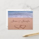 Cartão personalizado "salvar a data" ou "noivado" com dois corações desenhados na areia e fundo azul do oceano. Mude facilmente os seus nomes para o seu evento especial.