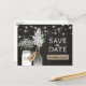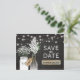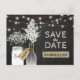 MODELO DE SALVAR A DATA COM LUZES DE CORDÃO EM JARRO DE MASON | Um fundo rústico de quadro negro, luzes cintilantes, um jarro de mason e uma garrafa com uma etiqueta de presente amarrada com as iniciais do casal, flores brancas doces, um pedaço de madeira country e palavras elegantes de salvar a data. Encontre outros cartões de salvar a data em http://www.zazzle.com/special_stationery
